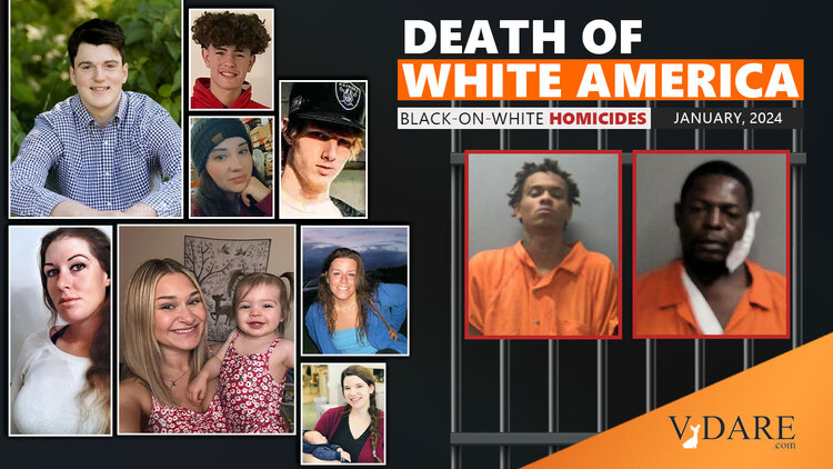 February is Black History Month! We’ll be reporting on the inevitable black-on-white homicide toll, but meanwhile here’s January’s total: 41 black-on-white killings, give or take a couple of “white Hispanics.” Of course there are the usual murders of white women by black Significant Others, but we also see home invasions, road rage, Drug Deals Gone Bad, and an extraordinary case in which an off-duty black Corrections Officer shot an unarmed white civilian multiple times and then fled the scene. Was he not screened for temperament? Ah, fuhgeddaboudit. Significantly, there are cases where racially blended families, presumably the integration ideal, turned out badly, including one where a black woman apparently poisoned the white child of her live-in lover. We also detect at least a couple of black immigrants, although the Regime Media represses news of immigrant crime even more fanatically than black-on-white homicide. And, needless to say, the random savagery that seems to happen all the time around blacks, cf. John Derbyshire’s The Talk.