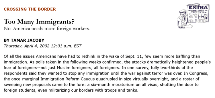 To be sure, immigration opponents have also had some significant setbacks. Most notably, the Republican Party, which stood staunchly with them in the mid-1990s in California, is now firmly on the other side of the issue—if anything, George W. Bush has become the country's leading advocate for liberalizing immigration law. But there can be no mistaking the depth of public concern over one or another of the questions raised by the restrictionists, and in the event of more attacks or a prolonged downturn, their appeal could surely grow.