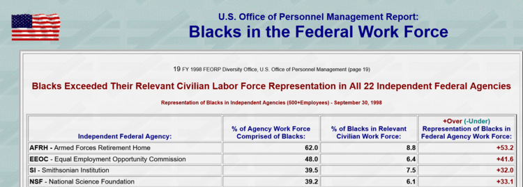 Blacks are overrepresented in the National Science Foundation by 504.7 %; in the Pension Benefit Guaranty Corp. by 538.7 %; in the Securities and Exchange Commission by 452.1%; in the Smithsonian Institution by 452.1%, in the Federal Communications Commission by 370.1%; in the Social Security Administration by 263.5%; in the Commodity Futures Trading Commission by 375%; in the Office of Personnel Management by 286.7%; and so on.