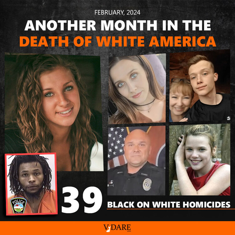 The February 22 murder of a young white woman by a mestizo Venezuelan illegal alien released into the U.S. by the Biden Regime has finally broken through MSM censorship and gotten the attention of the U.S. Congress [Georgia congressman introduces ’Laken Riley Act’ after nursing student’s murder on UGA’s campus, by Karys Belger, 11Alive.com, March 4, 2024]. About time too—but the fact is that there are many more equally horrific black-on-white homicides each month (including, this month, at least one by a Colombian illegal immigrant). When is Congress going to notice this?