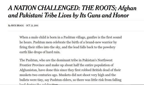 When a male child is born in a Pashtun village, gunfire is the first sound he hears. Pashtun men celebrate the birth of a brand-new warrior by firing their rifles into the sky, and the lead falls back to the powdery earth like drops of hard rain… Muskets did not shoot very high and the bullets were tiny, say Pashtun elders, so there was little risk from falling lead during the celebration. Then, generations later, Pashtun took Kalashnikov rifles from Soviet soldiers they killed in the war that led to an ignominious Soviet retreat in 1989. "But the Kalashnikov bullet was so big and heavy that, when we fired it in celebration, it dropped back down back out of the sky, and killed us." … That does not mean the shooting stopped. Tradition, the elder said, holds firm here. Even the police, who frown on the power of tradition, are ignored. "A law, a government, is not so much a factor here," Mr. Taizi said. …