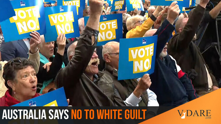 The purpose of the Voice was never clear. The government said the new body would help the Indigenous, but that it also wouldn’t be part of the government. Why have it then? The Prime Minister claimed there was “no cost” to the proposal, but what would it do? The truth is that a referendum victory would delegitimize white Australians’ claim to be the founding population. They would be guests on “Aboriginal land,” with no legitimacy. There would also be an official body that could be counted on to shame white Australians (i.e., real Australians), demand more money, and hand out patronage to non-whites and radical activists.
