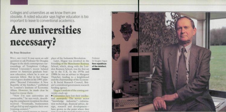 Well, are they? It may seem an odd question to ask Professor Sir Douglas Hague [1926-2015] in the sleek contemporary surroundings of Templeton College, Oxford University's recent belated answer to American graduate business education, where he is now an associate fellow. But in fact Hague voiced grave doubts in his 1991 pamphlet "Beyond Universities: A New Republic of the Intellect," [PDF] published by London's Institute of Economic Affairs. However, he made clear he hoped to rescue them.