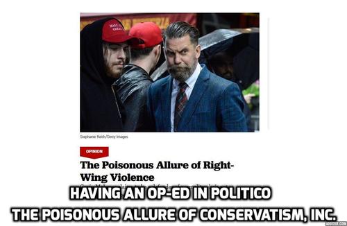 Leading the Conservatism, Inc. charge against the Proud Boys: National Review editor-in-chief Rich Lowry. In an op-ed published at Politico, Lowry [Email him] sobbed over the “poisonous allure of right-wing violence” and dismissed McInnes as nothing more than an opportunistic huckster—unlike the very principled conservative-denouncing professional token conservatives in POLITICO. The cuckservative gatekeeper also attacked McInnes’ for writing for—GASP!—“rancid” sites like VDARE.com and Takimag (as opposed, presumably, to flaccid sites like NRO) before delivering his opinion on what real men do in the face of Antifa violence: apparently, nothing.