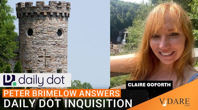 VDARE.com Editor Peter Brimelow writes: There’s apparently another incoming Regime Media attack on VDARE.com and our temerity in daring to find an immigration patriot conference venue after years of being Cancelled—this time by the fashionable Daily Dot webzine. The writer, Claire Goforth, has less excuse than most because she’s originally from nearby in West Virginia and seems to have its characteristic Scotch-Irish red hair. This is our email exchange.