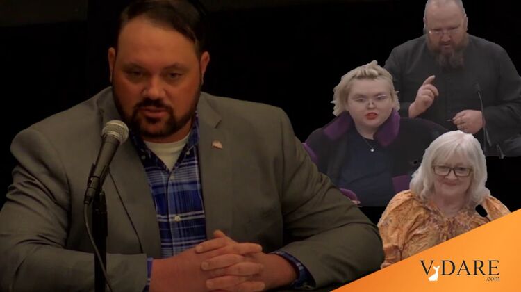 Blevins has faced his accusers publicly at least twice in the past two weeks. At a scheduled city council meeting on March 19th, a parade of activists took turns airing complaints and accusations. Some unhinged hysterics went so far as to name-drop James Fields and Dylann Roof, seemingly implying that anyone with right-wing views is a dangerous potential killer. Others noted with alarm that Peter Brimelow’s VDARE.com and Jared Taylor’s American Renaissance have run articles supportive of Blevins [Far-Left and Media Try to Stage a Coup, by Gregory Hood, American Renaissance, March 18, 2024]. (One pointed out that Dylann Roof had liked Jared Taylor, and another read aloud a supposedly inciting tweet from Peter Brimelow.)