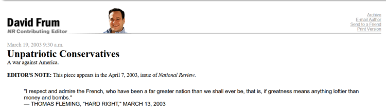 The attack itself is the work of David Frum, a former White House speechwriter who supposedly coined the phrase "axis of evil" for President Bush's state of the union address last year.