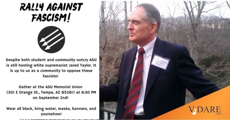 Arizona State University College Republicans United (ASU CRU) [Tweet them], a splinter Republican college club, made the bold decision to invite American Renaissance Editor Jared Taylor to speak last Friday, September 2, his first campus appearance in some ten years. Despite a torrent of calls demanding cancellation of the event from R.A.F., no not the Red Army Faction, but Rally Against Fascism, as well as other various Antifa and Black Lives Matter organizations—and finally of course from the Left’s fellow travelers, the Establishment ASU College Republicans—the University Administration stood firm. ASU spokesman Jay Thorne said: