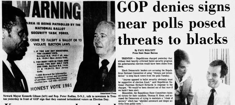 But that’s not the end of the story. The Democratic National Committee was outraged at losing what they thought was a safe state [Jersey Controversy Widens Over G.O.P. Patrols At Polls, By Richard J. Meislin, New York Times, November 7, 1981]. So they filed suit, charging the RNC and the state Republican Committee with “illegal harassment and voter intimidation.”