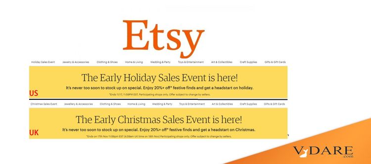 I wanted to contribute again this year to VDARE.com’s War Against Christmas coverage, by bringing to your attention the meticulous nature of how corporate advertisers and marketers across the board carefully delineate two separate ”December celebrations,” depending on which side of the Pond you are on.