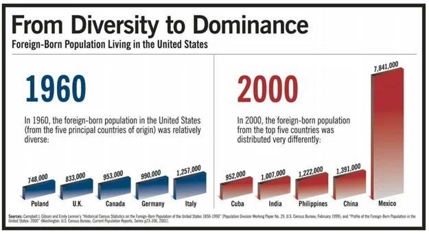 He's arguing that the sheer number of Hispanic immigrants and the sheer numbers of those who will keep coming if immigration isn't halted, plus their very different linguistic, cultural, and political identities, will serve to split American society in two.