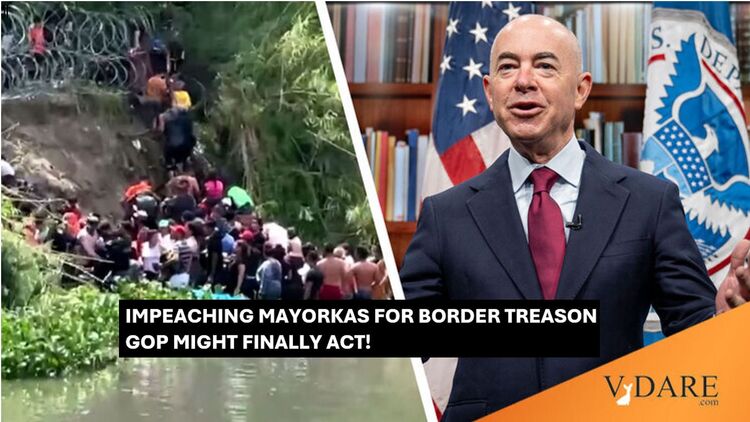 House Republicans might FINALLY impeach Department of Homeland Security Secretary Alejandro Mayorkas! The House Homeland Security Committee plans to hold a hearing this week on the matter [ House Republicans plot swift impeachment of Homeland Security Secretary Mayorkas as moderates signal support, CNN, January 7, 2024]. It’s been a long time coming. The GOP campaigned in 2022 on the implied promise they would punish Mayorkas for the southwest border invasion. Yet once Republicans got the House majority, they failed to act. It appeared that they might not keep that promise. But now, signs are that the New Year has brought a new focus for the party. A Mayorkas impeachment would keep the headlines centered on what matters: the Great Replacement Biden Rush of illegal aliens. And it’s easier than impeaching Joe Biden for corruption.