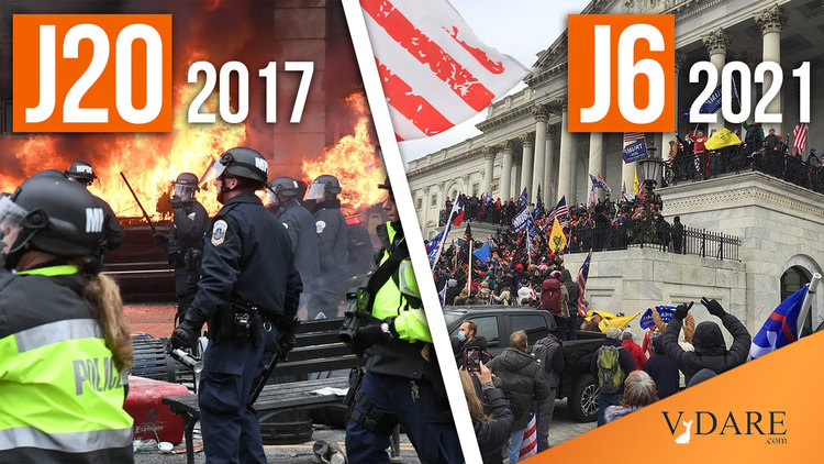 Yet some that day clearly conspired to start trouble, knowing a crackdown against dissidents would ensue. Present at the J6 protests were mysterious individuals (Antifa? FBI?) who encouraged violence, as VDARE.com’s Peter Brimelow noted a month later. [Glenn Greenwald And Darren Beattie: New Evidence Of FBI Involvement In January 6 Capitol Riot, RealClearPolitics, October 1, 2021]