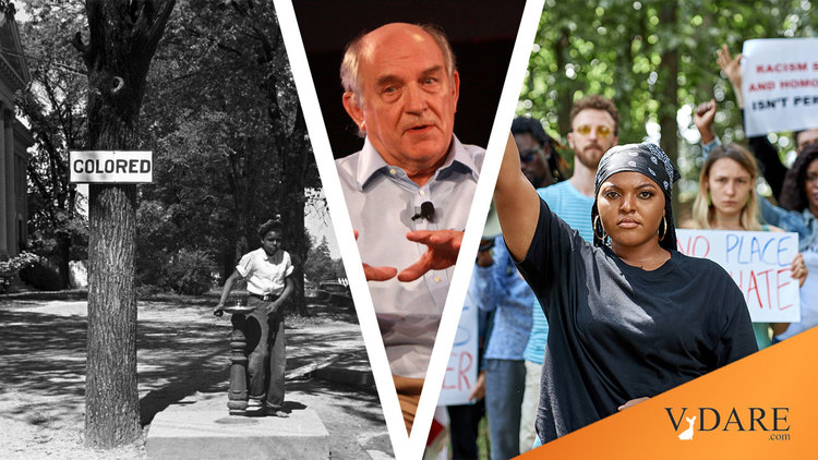 Those latter two segments are what I'm comparing: Jim Crow, when blacks were under legal disabilities in some states and social disabilities most everywhere, and Jim Snow, when blacks enjoy preferences and favoritism, "racism" is a sin of well-nigh religious gravity, and a white person who expresses negativity towards blacks is excluded from polite society and social media.