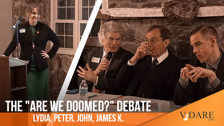 After dinner Saturday evening we had a debate on the subject: Are We Doomed? The pessimists, arguing that we are doomed, were myself and James Kirkpatrick; the other side, the optimists, were Peter Brimelow and James Fulford. Polling before and after the debate showed no minds changed, with pessimists a 58 percent majority in both polls.