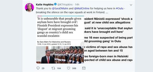 The Finnish MSM were fascinated by Hopkins’ visit, though did all they could to smear her with tabloid Ilta-Lehti headlining that: “Rude media personality who is super-popular in Britain flies to Oulu due to child rape—accused of racism, fired for a Nazi reference”. [Briteissä supersuosittu rääväsuinen mediapersoona lensi Ouluun lapsiraiskausten takia—syytetty rasismista, natsiviittaus poiki potkut, Ilta-Lehti, January 14, 2019]