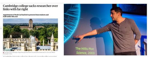 Matthew Bullock [Email him] Master of Cambridge University’s St Edmund’s College in Britain has just announced that it is firing its 28-year-old research fellow, Dr Noah Carl, because he had “collaborated with a number of individuals who were known to hold extremist views.” These “individuals” were other scientists. The Master added that “the ideas [Carl] has expressed have had a detrimental effect on the atmosphere within the College with feelings of hurt, betrayal, anger and disbelief that the College could be associated with such views” [Cambridge college sacks researcher over links with far right, by Richard Adams, Guardian, May 1, 2019].