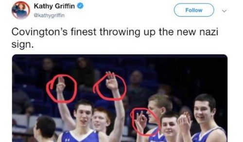 Comedienne-turned-decapitation fetishist Kathy Griffin gleefully attacked the boys, tweeting "Covington's finest throwing up the new nazi sign."