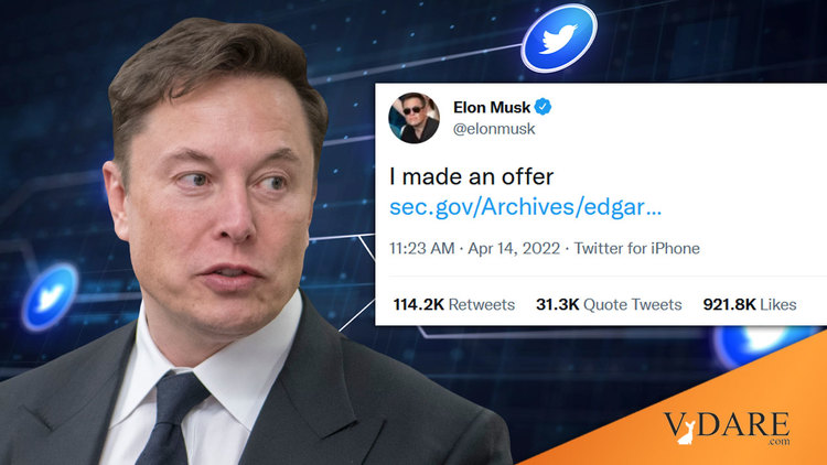 Musk’s move to buy Twitter does not mean he is our guy, even if one does wonder what the South African –born entrepreneur thinks about post-Apartheid South Africa. But then again, he’s not not our guy. His enemies are our enemies, the very Tech Totalitarians who have silenced important voices on the right: Alex Jones to Laura Loomer to Jared Taylor to Stefan Molyneux. (VDARE.com is still on Twitter, probably because it has pulled its punches, but has been banned by Facebook, PayPal, Amazon etc.) Yet such personalities had audiences an order of magnitude greater than Warner Media’s $300 million failed CNN+ could muster. That effort sank like a rock just a month after start-up. Fewer than 10,000 people were interested [CNN+ fails, shut down after only one month, SaraCarter.com, April 21, 2022].