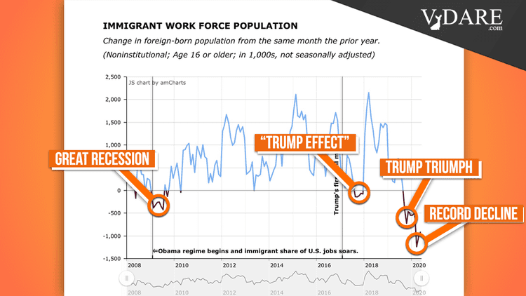 It’s an ill crash that blows no-one any good. The U.S. job market unexpectedly sprang to life in May as employers added 2.5 million jobs and the unemployment rate plummeted. It was, by a gigantic margin, the biggest payroll surprise in history. But even more significantly from VDARE.com’s point of view, the immigrant workforce population has continued to fall, and immigrant displacement of American workers is back down to levels not seen since way back in the Obama Administration. This presents Donald Trump with a great opportunity: he can lock in the recovery’s benefits for the American worker — and stem recent immigration’s damage to the GOP — if he acts on his instincts and imposes an immigration moratorium.