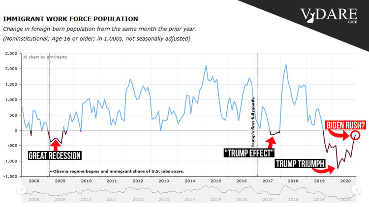 The average monthly decline in immigrant workers during the 15 month-long “Trump Triumph” was more than double what we saw in the 2008 Great Recession. Back then, immigrants were leaving at the rate of 300,000 to 400,000 a month, year-over-year.
