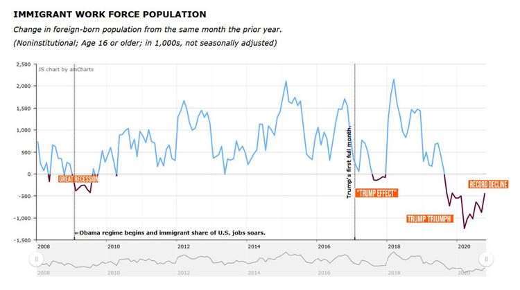 As far as employment levels are concerned, both groups are doing poorly right now because of the pandemic: from the start of the Trump Administration (January 2017) through October 2020, native-born Americans lost 1.050 million jobs, a 0.832% decline, while immigrants lost 1.225 million, a 4.7% reduction.