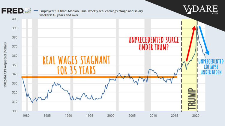 The result: the extraordinary 2017-2021 Trump surge in real incomes, attributable at least in part to his curtailment of immigration through executive action and low inflation, has dramatically busted under Biden, attributable at least in part to his unleashing immigration and monetary laxness.