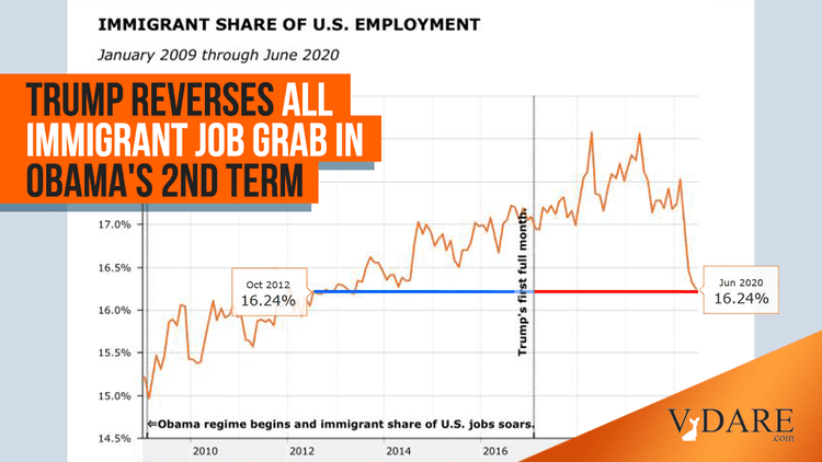 Much to the horror of the Dem/Main Stream Media Complex, June’s job data seemed to confirm that a “V-shaped recovery” is underway. And, even more significant from VDARE.com’s standpoint: Both the immigrant workforce population (legal and illegal, federal data does not distinguish) and immigrant displacement of American workers continue their remarkable collapse. This is developing into a major, if unreported, Trump triumph—but it must be locked in, at least by prolonging the temporary immigration moratorium he finally enacted June 22.