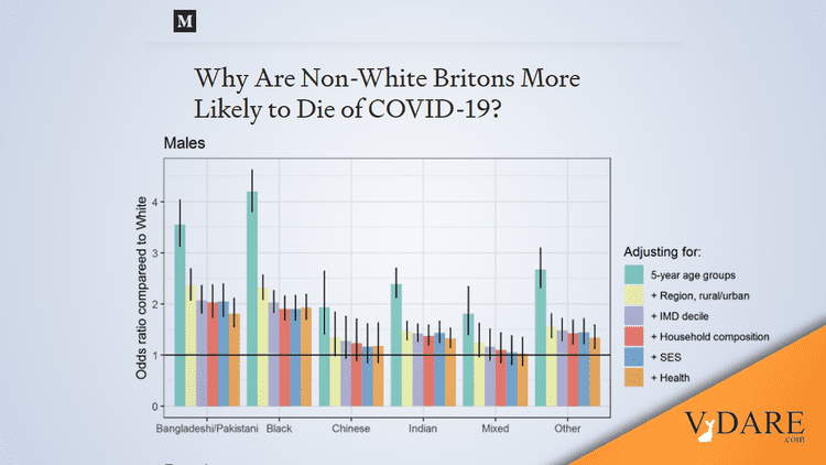 More recently, Carl has penned a careful and detailed article arguing, in the most systematic way I have yet seen, that genetically-caused race differences in Vitamin D deficiency is the most parsimonious explanation of the race differences in fatality from Covid-19 [Why Are Non-White Britons More Likely to Die of COVID-19?, by Noah Carl, Medium, May 17, 2020]