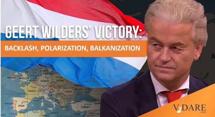 Though Wilders has toned down his rhetoric in recent years in order to make his Freedom Party more electable, his policies have included banning the Koran and banning the building of new mosques in the Netherlands, and he has a “Hate Speech” conviction for referring to Moroccans in the Netherlands as “scum.” In 2009, he was briefly banned from the U.K. as a threat to public order, and he has lived under police protection since 2004 due to threats over his views on Islam. (This is not a joke: the previous most prominent immigration patriot leader, Pim Fortuyn, was assassinated by a white Leftist pro-immigration fanatic in 2001.) His current policies include the Netherlands leaving the European Union, banning Islamic headscarves in public buildings, a complete halt to asylum seekers entering the country, ending all foreign aid, and putting the Dutch people first [Geert Wilders: Who is he and what does he want?, by Paul Kirby, BBC News, November 24, 2023].