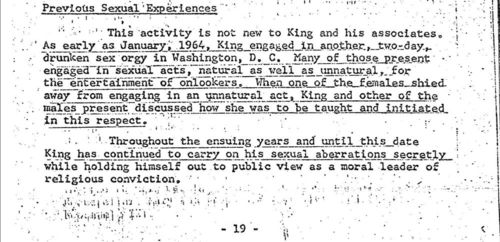 We don’t need to wait until 2027 to get a glimpse of what’s in store because a 20-page report on King by the FBI was inadvertently released last year when some JFK files were declassified. [Martin Luther King, Jr., A Current Analysis, March 12, 1968, FBI.gov PDF] It detailed the orgies that King routinely set up around the country [JFK File: FBI Monitored Martin Luther King's 'Abnormal' Sex Life of Orgies, Hookers and Joan Baez, By Tom Porter, Newsweek, November 4, 2017]. In one such orgy, the FBI reported that when a female participant “shied away from engaging in an unnatural act, King and other of the males present discussed how she was to be taught and initiated in this respect.”
