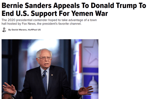 Sanders was talking about a War Powers Act resolution that would have ended U.S. involvement in the five-year civil war in Yemen that has created one of the great humanitarian crises of our time, with thousands of dead children amidst an epidemic of cholera and a famine.