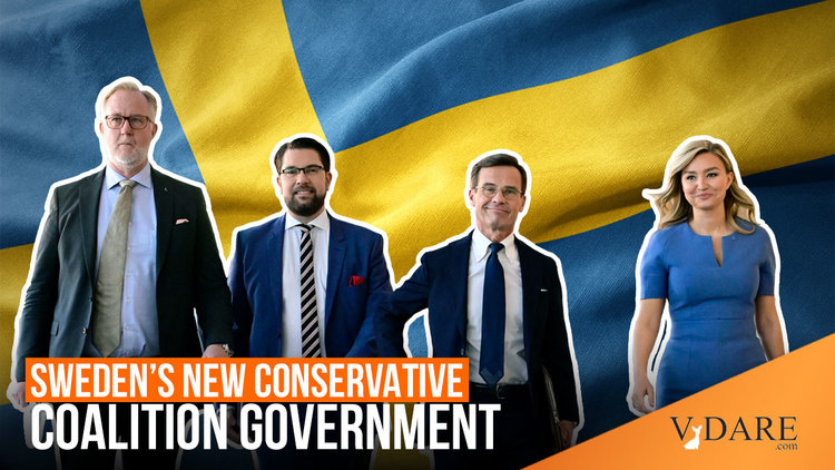 The new coalition is composed of the Moderates; the small Christian Democrats (who, in Sweden, unlike in Germany, do have a strong Christian orientation), who took 6%; and the even smaller “Liberals” (meaning economic liberals, free marketers) who garnered just under 5% of the vote. But obviously that is not enough to get any legislation through parliament, so the power behind the throne is the Sweden Democrats, without whose support the government would collapse.