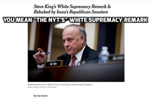 In King’s New York Times interview, King was quite clearly just asking why Republicans constantly find themselves being called “white nationalists” and “white supremacists” and why “Western Civilization” and “white” have become insults. (Note that the NYT article says ”Mr. King attracted the attention of hate-watch groups like the Anti-Defamation League as he spoke increasingly about preserving ‘Western culture’ or ‘Western civilization.’ The groups consider those buzzwords that signal support to white nationalists”—i.e. no expression of even cultural pride can be tolerated).