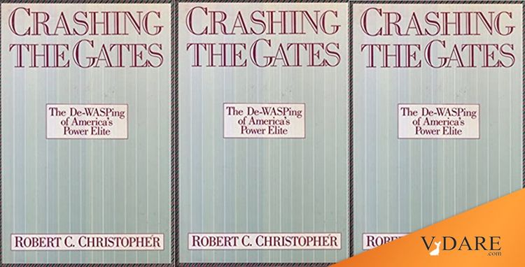I concluded my review by pointing out the paradox that affirmative action quotas applied in favor of low-performing groups like blacks and Hispanics, but not against high-performing groups like Jews and Asians, effectively mean that WASPS in particular and whites in general are squeezed out of elite colleges. As we note in the text below, Ron Unz subsequently documented this, to general approval, and Pat Buchanan cited it, to general hysteria. The point I made then remains all too true today: "What this really means is that WASPs (and non-Jewish white ethnics) have not yet found a political language in which to protest that they are in fact being systematically discriminated against."