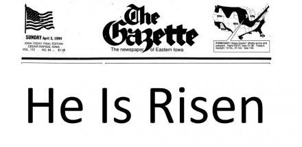 “When my family and I first moved to Iowa, our first Easter morning I read the second-largest newspaper in the state (the Cedar Rapids Gazette) with this headline splashed across Page One: HE HAS RISEN. The headline broke all the rules I was trying to teach my young journalism students: the event was neither breaking nor could it be corroborated by two independent sources. The editors obviously thought that everyone knew who He was, and cared.”