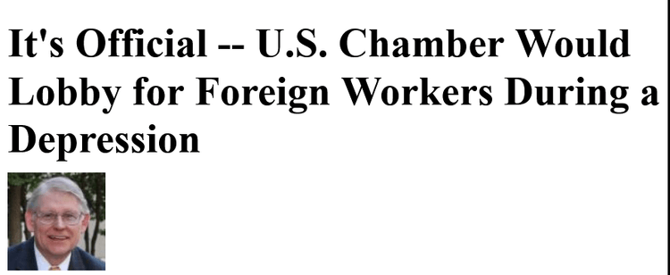 “The U.S. Chamber of Commerce's reaction to a limited set of stricter rules for banks hiring foreign workers answers a bar debate that long has raged. The question has always been whether if we had another Great Depression would the Chamber still continue to lobby for more foreign workers on the basis of worker shortages. This week, the debate is settled. YES, THEY WOULD! "It's Official — U.S. Chamber Would Lobby for Foreign Workers During a Depression", February 10, 2009