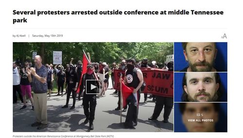 Tennessee taxpayers have a financial interest in such an effort. As always, law enforcement ably protected the conference; if you didn’t go outside, you wouldn’t know Antifa were even there. Yet the expensive effort required security checks at the doors, roadblocks, and even troopers on horseback. Antifa were provided an area near the venue to demonstrate, but they declined. Four people were arrested. [Several protesters arrested outside conference at middle Tennessee park, by Aj Abell, Fox 17 Nashville, May 18, 2019]