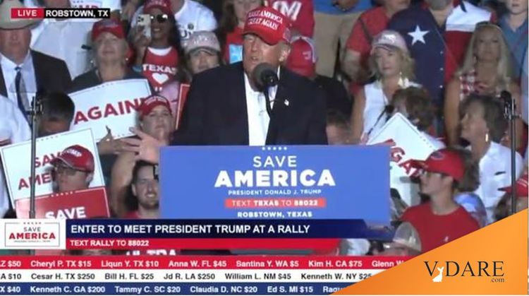 VDARE.com Editor Peter Brimelow writes: I know that American Renaissance Editor Jared Taylor and I are the last two people in the world who refuse to watch videos (and he makes them!) But I did actually watch/ listen to Donald J. Trump’s October 22 Saturday night speech in Robstown TX, partly because you can get really no idea of what the 45th President of the United States really said by reading the Regime Media reports; and partly because it annoys me that he’s being so systematically suppressed by the TV networks. What are they afraid of? We make this transcript available as a public/patriot service,