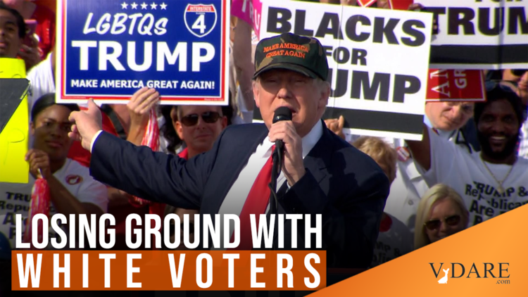 The Main Stream Media has finally discovered that President Donald J. Trump's real weakness is with whites [‘It’s a big, big swing’: Trump loses ground with white voters, by David Siders, Politico, September 21, 2020]. Of course at VDARE.com we’ve been calling attention to this for months, and blaming Jared Kushner’s strategy of pandering to minorities. What’s really disturbing: even Rasmussen Reports, which recently showed Trump with his first-ever lead over Joe Biden (47%-46%) and therefore got no MSM publicity, shows this weakness with whites. The good news: Trump has upside potential. The bad news: it’s awfully late.