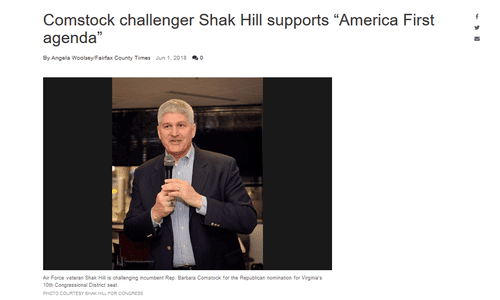 The race for my home VA-10 Congressional District, currently held by appalling GOP Establishment favorite Barbara Comstock, has been getting more than its usual share of news coverage in the lead-up to the June 12th primary. Nathan Larson, an independent candidate, is an admitted pedophile, an admirer of Adolph Hitler, believes women should be treated as property and wants to make child marriage and incest legal. Democratic hopeful Dan Helmer recently compared President Trump to Osama bin Laden. And, on a more controversial note, Comstock is being challenged by a Trump conservative: former Air Force captain and financial planner Shak Hill.