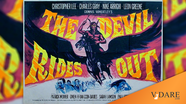 Like many of you, I’ll spend this Halloween bingeing on my favorite horror movies. Tops among them: 1968’s The Devil Rides Out, a Christopher Lee vehicle based on the novel of the same name. It’s about three friends and their spiritual battle with an evil magician. The story subtly reveals the old-time Anglo-American conservatism of author Dennis Wheatley, a novelist-turned-British agent deeply involved in hugger-mugger planning against the Germans in World War II. He was a conservative, a race-realist, and an unabashed defender of the Christian civilization that formed him.