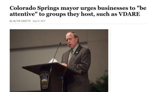 On March 7, I posted “PATRIOTS HAVE RIGHTS. THEY HAVE JUST NOT ORGANIZED TO DEFEND THEM—UNTIL NOW.” Peter Brimelow On VDARE.com’s First Amendment Civil Rights Suit Against CO Springs RINO Mayor John Suthers, which summarized of Colorado Springs Mayor John Suthers’ attack on our First Amendment rights and its role in the 2017 cancellation of our planned Colorado Springs conference. Explaining our need to raise money to fight back, I wrote: