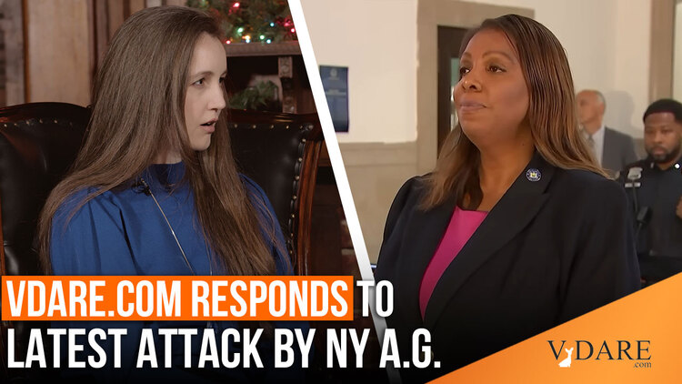 Below, VDARE.com Publisher (and President of the VDARE Foundation) Lydia Brimelow and VDARE.com Editor Peter Brimelow talk about New York State Attorney General Letitia James lawfare attack on VDARE.com. (See links above for details.) They reveal that NYAG James is now going after VDARE.com’s outside directors.