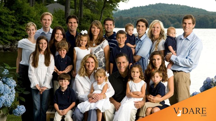 Above: Steve Sailer has been pointing out for years how Democrats are driven crazy by Mitt and Ann Romney’s annual Christmas card featuring all their handsome grandchildren: those Republicans are trying to breed their way to victory. The Romneys, though not as conservative as us, look like the best type of American.