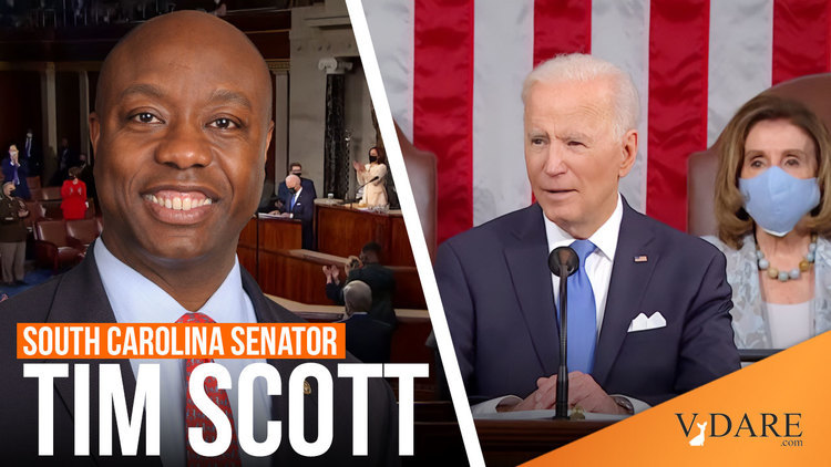 Biden and Scott both accepted the Bizarro World framing of racial issues in this country, where whites become the perpetrators rather than the victims of government policy. Both ignored the staggering nationwide crime increase, with blacks both the principal perpetrators and victims (not that anyone cares, least of all blacks). Both accepted the inevitability of mass immigration. And other critical issues—Antifa and continuing mob violence, the collapse of the Rule of Law as shown in the Derek Chauvin lynching, and the disintegration of American sovereignty and identity—were simply papered over with greeting-card clichés.