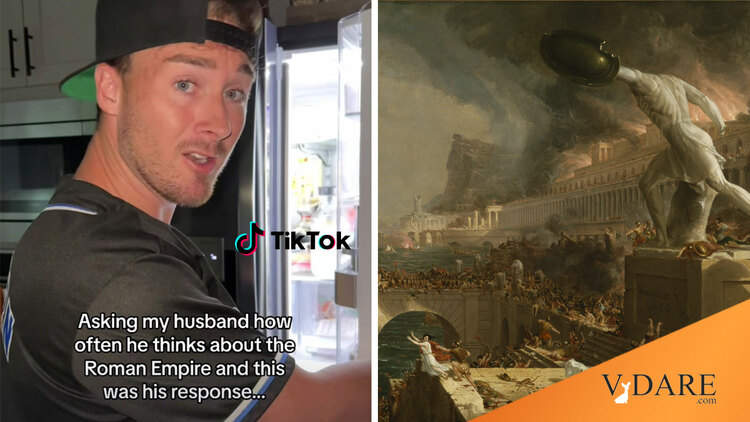 The hashtag #roman empire has reportedly been viewed over a billion times on TikTok, with most videos women asking men the question: How often do you think about the Roman Empire? The surprising answer: a lot. Feminist historian Mary Beard, of course, says it’s because of male chauvinism [How often do you think about the Roman Empire? Expert has thoughts on the new TikTok trend, SkyNews, September 27, 2023]. Well, here’s one reason to think about it: I believe the rise and fall of Rome coincided with the rise and fall of Roman intelligence. Rome fell because its people were becoming less intelligent. And the same thing is happening today.