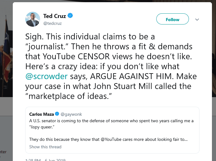 Sigh. This individual claims to be a “journalist.” Then he throws a fit & demands that YouTube CENSOR views he doesn’t like. Here’s a crazy idea: if you don’t like what @scrowder says, ARGUE AGAINST HIM. Make your case in what John Stuart Mill called the “marketplace of ideas.” https://t.co/uzhMqz3lv5