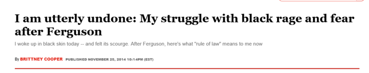 See the article on Salon: I am utterly undone: My struggle with black rage and fear after Ferguson, November 25, 2014.