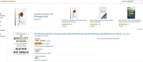 If I hadn't been sure before about the massive left-wing bias of our elite companies, I sure was after a recent experience on Amazon. I searched for Heather Mac Donald's soon to be released book The Diversity Delusion: How Race and Gender Pandering Corrupt the University and Undermine Our Culture , in which she exposes our universities as "machines of hatred" which crank out little zealous heretic hunters by the millions.